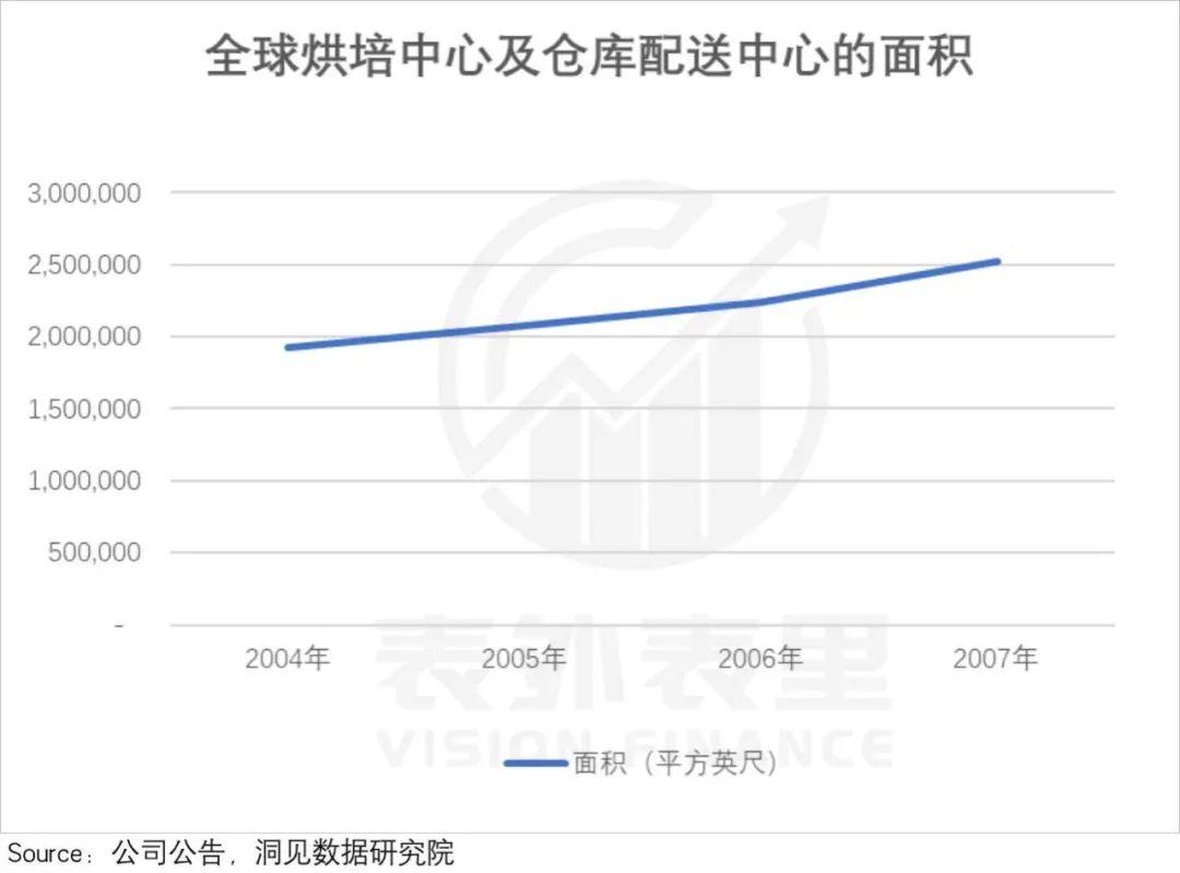 如下圖,2004-2007年,星巴克全球烘焙中心及倉庫配送中心面積,擴(kuò)大了接近600平方英尺;倉儲(chǔ)配送中心數(shù)量激增到12家。