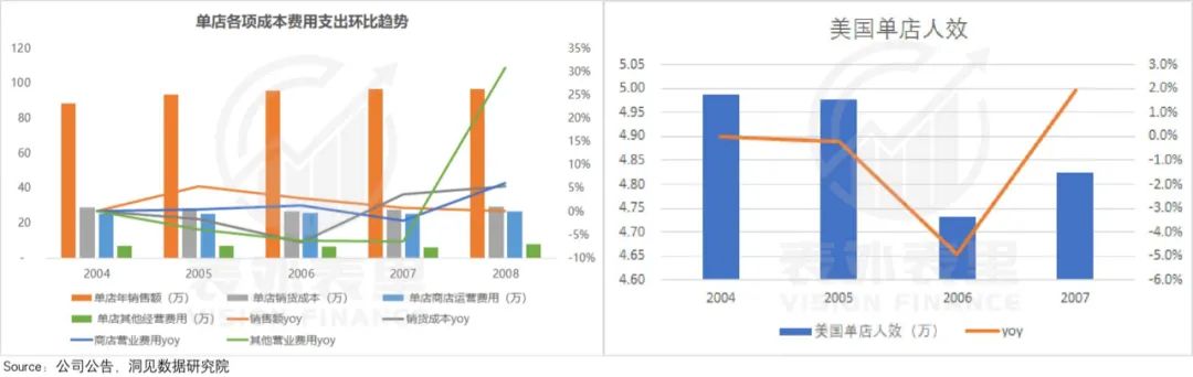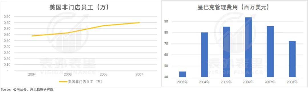 數(shù)據(jù)顯示,2000-2008年,伴隨著門店快速擴(kuò)張,管理難度的提升,星巴克的管理和總部運(yùn)營等非門店人員數(shù)量攀升。這帶來了管理費(fèi)用的拉漲。