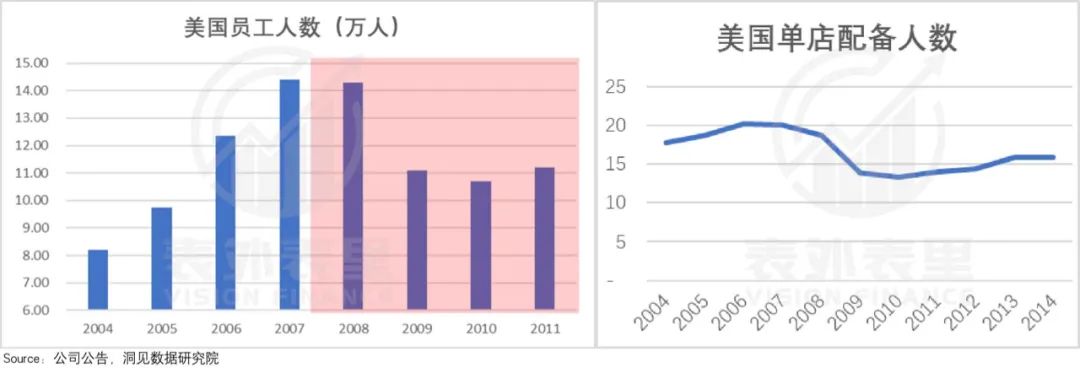 可以看到,2009年星巴克的門店員工減員接近3.2萬,單店配備人數(shù)從20人降到了14人左右。