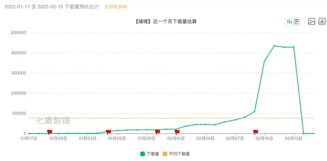 根據(jù)七麥數(shù)據(jù)顯示,“啫喱”下載量在App Store上線(xiàn)后的第7天開(kāi)始出現(xiàn)了明顯上漲的趨勢(shì),到2月11日,其日下載量達(dá)到了峰值,為494966次,登頂App Store的免費(fèi)排行榜,這個(gè)日下載量的峰值接近了字節(jié)旗下社交產(chǎn)品“多閃”在同時(shí)間段內(nèi)的最高日下載峰值,啫喱在近一個(gè)月內(nèi)的預(yù)估總計(jì)下載次數(shù)也達(dá)到了227萬(wàn)次,可見(jiàn)這款社交產(chǎn)品在前期的數(shù)據(jù)表現(xiàn)相當(dāng)亮眼。