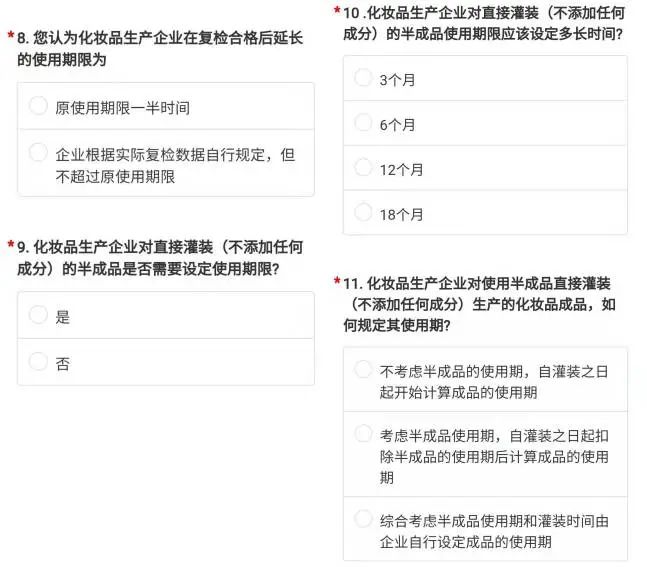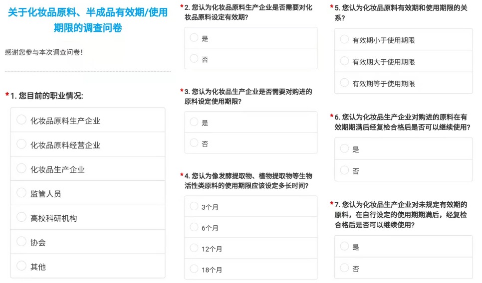 記者了解到,此調(diào)查問卷共有11個問題,包括化妝品原料有限期/使用期限的設(shè)定、設(shè)定時長,原料復檢合格后的使用期限、時長等具體問題,涉及到化妝品原料生產(chǎn)企業(yè)、化妝品生產(chǎn)企業(yè)等行業(yè)多個主體。