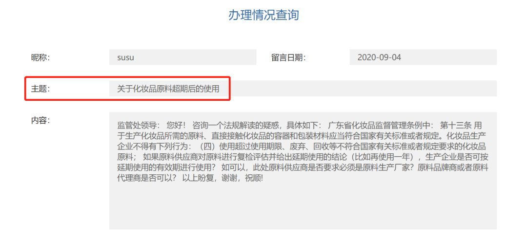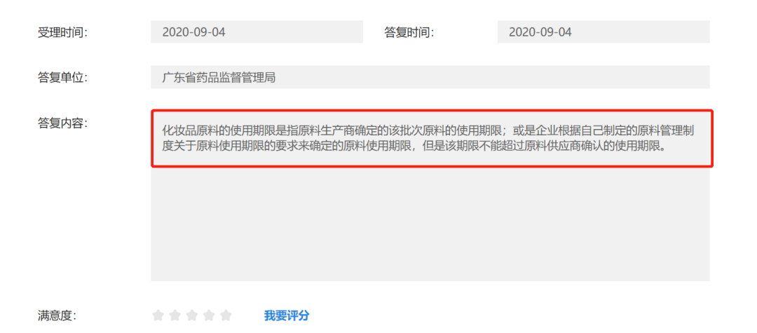 2020年,廣東省藥監(jiān)局在互動交流板塊中給出“化妝品原料超期使用問題”的相關(guān)解答。其中提到,“化妝品原料的使用期限是指原料生產(chǎn)商確定的該批次原料的使用期限;或是企業(yè)根據(jù)自己制定的原料管理制度關(guān)于原料使用期限的要求來確定的原料使用期限,但是該期限不能超過原料供應(yīng)商確認的使用期限”,采用的也是“使用期限”的概念。
