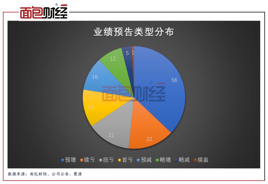 按照業(yè)績預(yù)告類型劃分,預(yù)增(上年同期盈利,預(yù)告期盈利增幅大于50%或明確表示業(yè)績將有“大幅增長”)企業(yè)數(shù)量最多,達(dá)到56家。其次分別為續(xù)虧、扭虧企業(yè),數(shù)量分別為22家和21家。此外,還有18家企業(yè)出現(xiàn)首虧(上年同期盈利,預(yù)告期虧損)、16家企業(yè)出現(xiàn)業(yè)績預(yù)減。