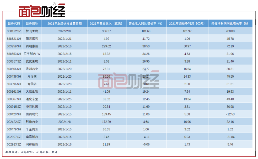 盈利方面,智飛生物增長最快且是唯一增速超過100%的企業(yè)。其余企業(yè)中,藥明康德、陽光諾和、片仔癀、通化東寶的2021年歸母凈利潤增速也超過四成。