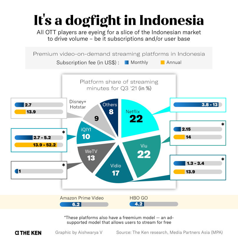 一位流媒體行業(yè)高層表示,印尼市場的競爭最為激烈。"印尼的貨幣化程度相比于馬來西亞要低兩倍,這意味著用戶流失率非常高。而且在印尼這樣的市場,消費者對價格非常敏感,所以定價越低越好,這就是為什么這些流媒體平臺的月均訂閱費在2到3美元之間。"