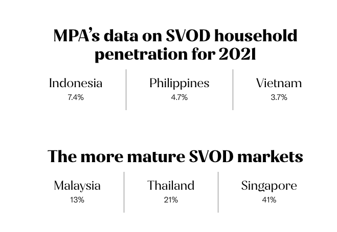 因此,當Prime Video釋放出了“我們在東南亞開放業(yè)務(wù)”的訊息之后,現(xiàn)有的玩家不應(yīng)輕視這一信號。MPA的T也贊同這一觀點。他說東南亞SVOD(訂閱VOD)行業(yè)的市場仍在增長,因為SVOD的家庭滲透率在該地區(qū)仍有很長的路要走。
