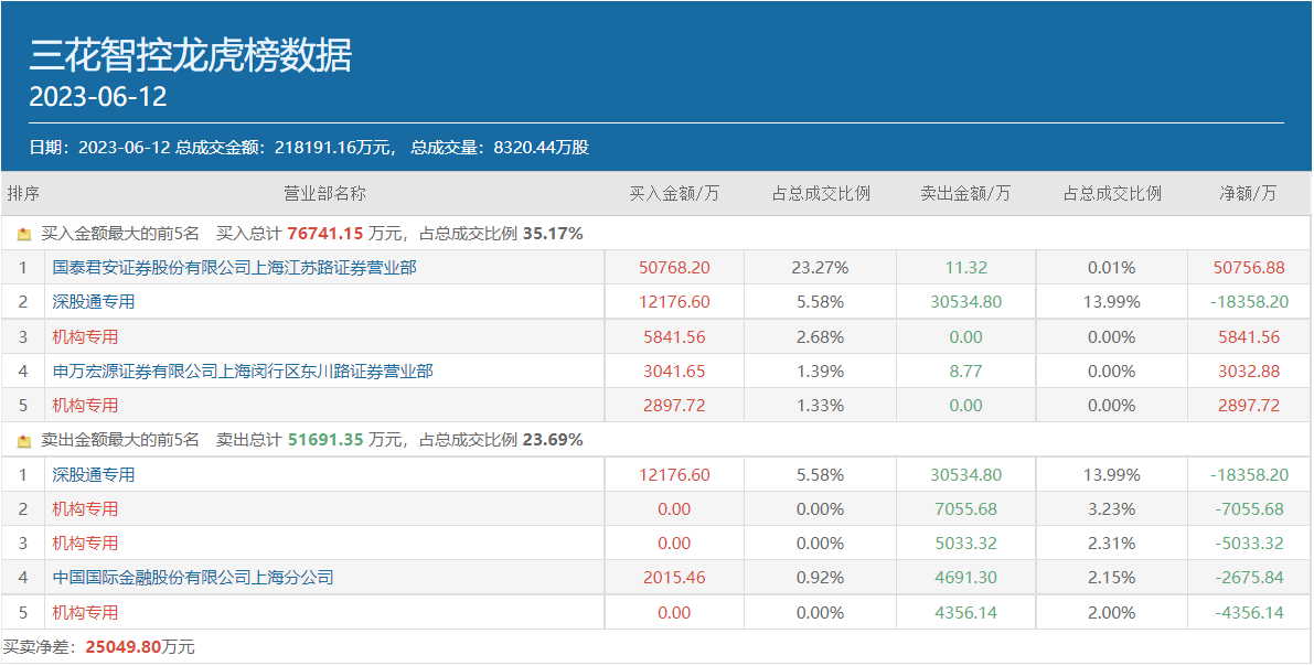 有意思的是,同樣是在今年一季度,國泰君安證券上海江蘇路曾于2月7日出現在三花智控龍虎榜買方榜首,并且買入金額為4.14億元,占該股當日總成交額的26.61%,如果章盟主一直持股至今的話,再加上6月12日最新買進的5.08億元,其持倉三花智控的市值又超過了9億元。