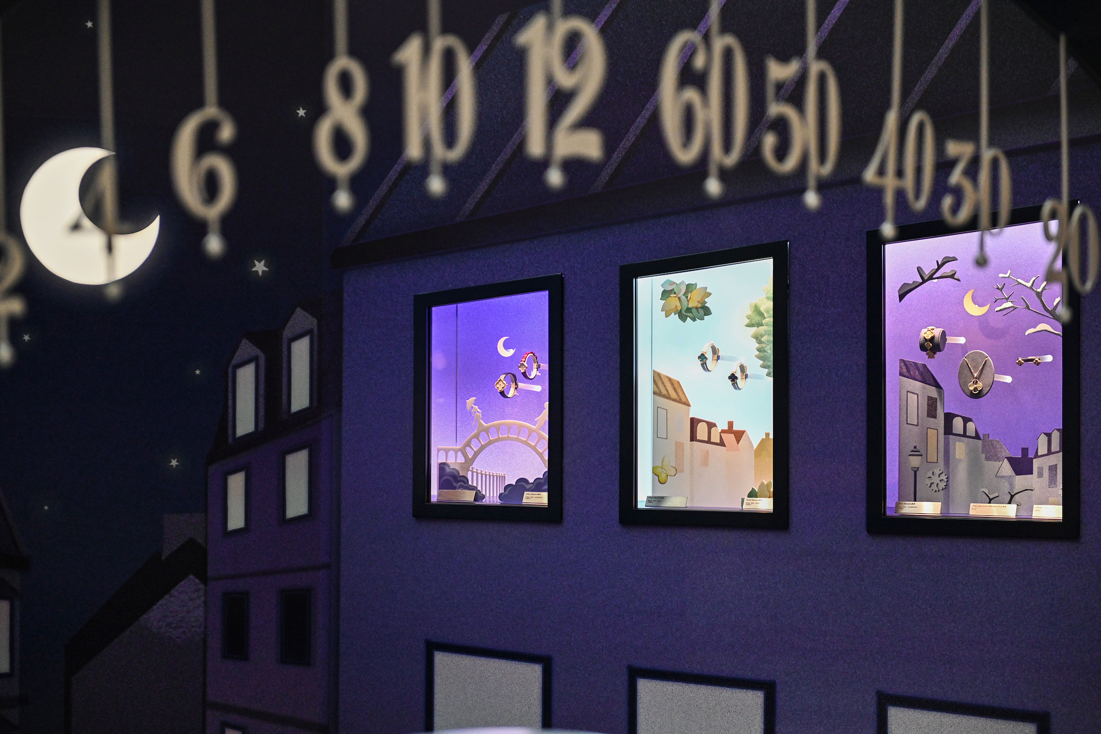 Night夜之頌歌空間以標志性的情人橋,配以暗夜繁星,描繪出一場詩意空靈的愛情故事。以愛情故事為靈感,延續(xù)情感至腕表作品中,在表盤生動呈現(xiàn)如夢似幻的世界。“Pont des Amoureux”系列腕表訴說著久別重逢的情深意切。在逆跳機芯的幫助下,分別代表小時和分鐘的愛侶一點一點靠近,傾訴彼此的思念之情。