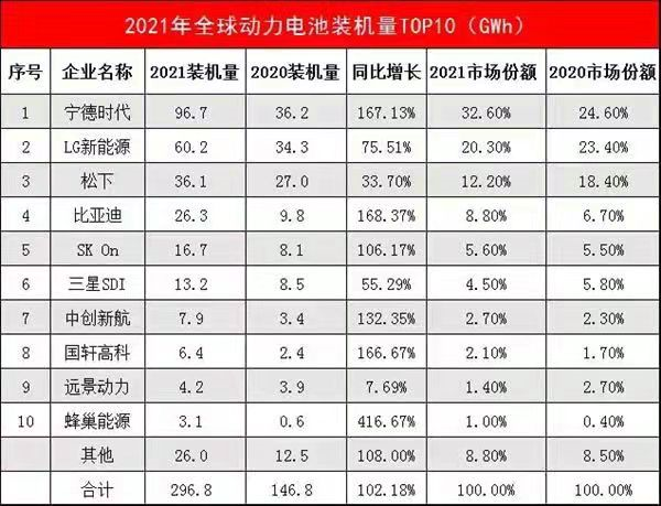 2月7日,韓國市場研究機構(gòu)SNE Research發(fā)布2021年全球動力電池裝機量排行榜。在榜單中,寧德時代位列冠軍,市占率達到33%;LG緊隨其后,市占率為20%。但LG的增長速度明顯快過寧德時代。2019年,LG的市占率僅為10%,彼時寧德時代市場份額為28%。