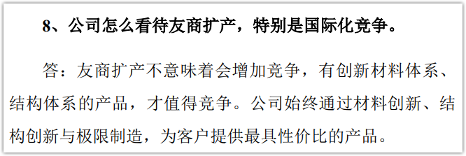 對友商們和自身相似的目標規(guī)劃,寧德時代還是不太在乎?!坝焉虜U產(chǎn)不意味著會增加競爭,有創(chuàng)新材料體系、結(jié)構(gòu)體系的產(chǎn)品,才值得競爭。”寧德時代如此回答投資者。
