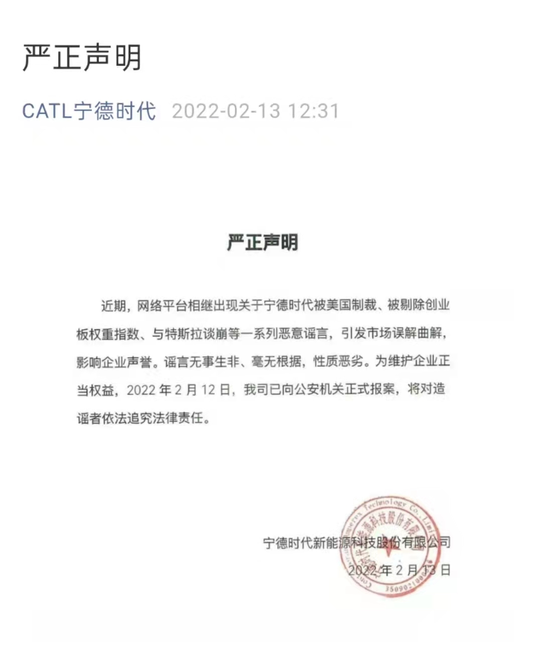 2月8日,網(wǎng)傳“寧德時代正在美國向?qū)I(yè)機構(gòu)求助,咨詢其被美國制裁的可能性”,隨后寧德時代方回應消息不實。