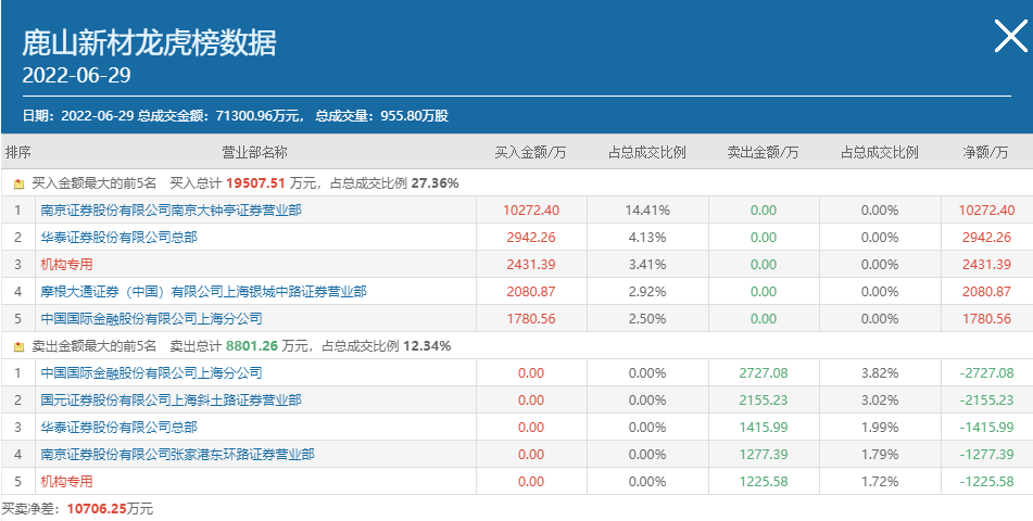 事實(shí)上,6月28日南京證券南京大鐘亭就曾出現(xiàn)在鹿山新材買方榜首,買入金額為6531.54萬元,當(dāng)日披露的3日龍虎榜中上述席位也高居買方第一位,買入金額為1.09億元。