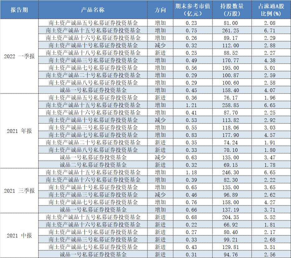 2021年三季報時,南土資產(chǎn)繼續(xù)加倉博眾精工,旗下6只產(chǎn)品的合計持股數(shù)量增加至855.69萬股,與之“同框”的除了上海希瓦之外,新增了上海博鴻資產(chǎn)以及南方基金。同年年報時,南土資產(chǎn)首次實現(xiàn)了對博眾精工前十大流通股東的包攬,持股數(shù)量合計為1180.99萬股,占該股流通A股的比例也超過了30%。