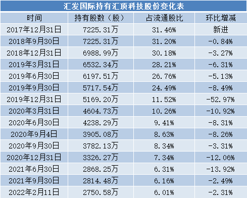伴隨著股價(jià)跌跌不休的是重要股東持續(xù)減持。匯發(fā)國(guó)際(香港)有限公司(下稱(chēng)“匯發(fā)國(guó)際”)是國(guó)際知名半導(dǎo)體企業(yè)聯(lián)發(fā)科技有限公司之控股子公司。在2017年末,匯發(fā)國(guó)際大筆投資匯頂科技,成為當(dāng)時(shí)最大的流通股東,持股量達(dá)7225.31萬(wàn)股,占流通股比例為31.46%,占總股本比例為15.91%。