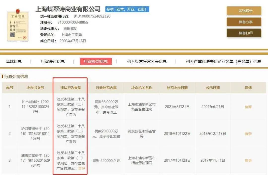 值得注意的是,這并不是雅詩蘭黛第一次被罰。據(jù)國家企業(yè)信用信息公示系統(tǒng)信息,雅詩蘭黛(上海)商貿(mào)有限公司早在2017年、2018年就曾兩度因利用廣告對商品或服務(wù)作虛假宣傳和發(fā)布廣告使用國家級、最高級、最佳等用語,分別被處罰8.88萬元和11萬元。