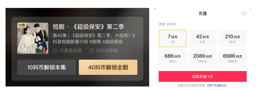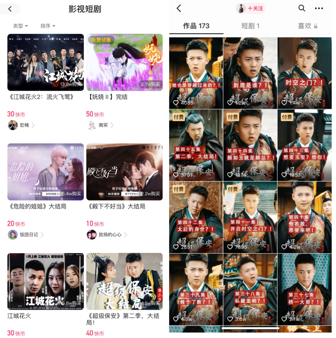 左:快手付費短劇 右:抖音付費短劇《超級保安》