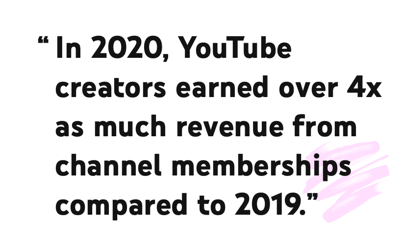 2017年,YouTube推出“超級聊天”服務,用戶可以通過付費來讓自己評論的內(nèi)容在不斷更新滾動的直播評論區(qū)中停留更長時間,同時也變得更醒目。2018年,YouTube又推出了“頻道會員”,這也就是前文提到愛奇藝隨刻所對標的模式——用戶為創(chuàng)作者付費后,可以專享更多獨家內(nèi)容。2020年時,YouTube官方稱頻道會員的收入已經(jīng)增長至2019年的4倍。