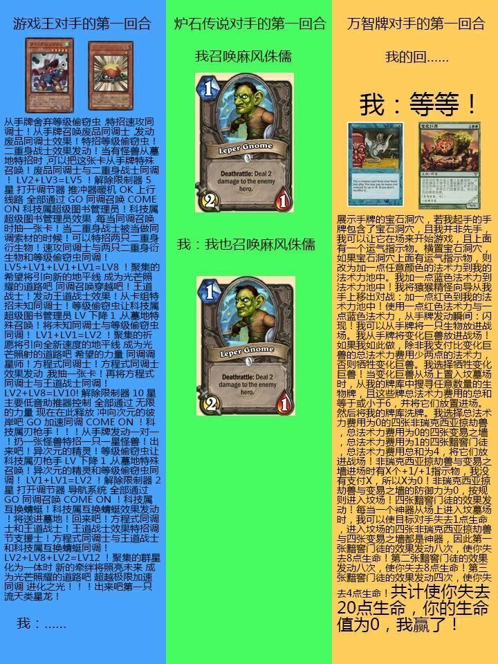 游戲本身的規(guī)則一改再改不說(shuō),一張卡上面描述文字密密麻麻近10行,打起牌來(lái)說(shuō)清楚你在干什么都要費(fèi)不少口水,游戲王也因此得了個(gè)外號(hào)叫“說(shuō)書(shū)王”。隔壁在線卡牌游戲爐石傳說(shuō)可就簡(jiǎn)單了不止一星半點(diǎn)。