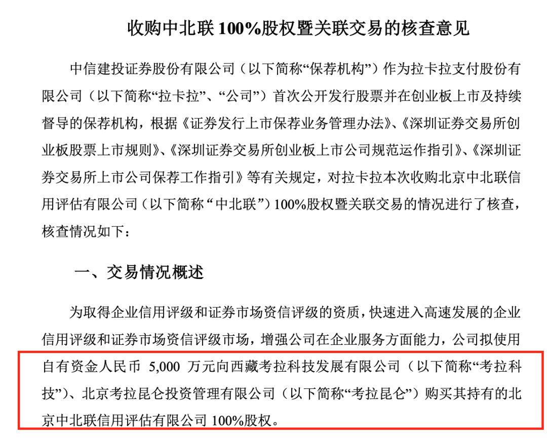 2021年8月,拉卡拉發(fā)布公告稱,擬收購關(guān)聯(lián)股東持有的北京中北聯(lián)信用評(píng)估有限公司 100%股權(quán)(以下簡稱“中北聯(lián)”),交易對(duì)價(jià)5000萬元,正式切入企業(yè)征信領(lǐng)域。