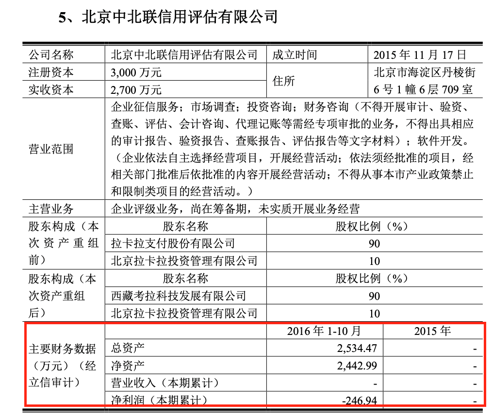 隨著其推動(dòng)上市進(jìn)程,拉卡拉聚焦主營業(yè)務(wù),在2016年8月集中剝離了增值金融等在內(nèi)的非主營業(yè)務(wù),如主營小額貸款業(yè)務(wù)的拉卡拉小貸、眾籌業(yè)務(wù)的考拉眾籌、影業(yè)業(yè)務(wù)的拉卡拉影業(yè)等,當(dāng)然也包括主營企業(yè)征信業(yè)務(wù)的中北聯(lián)。