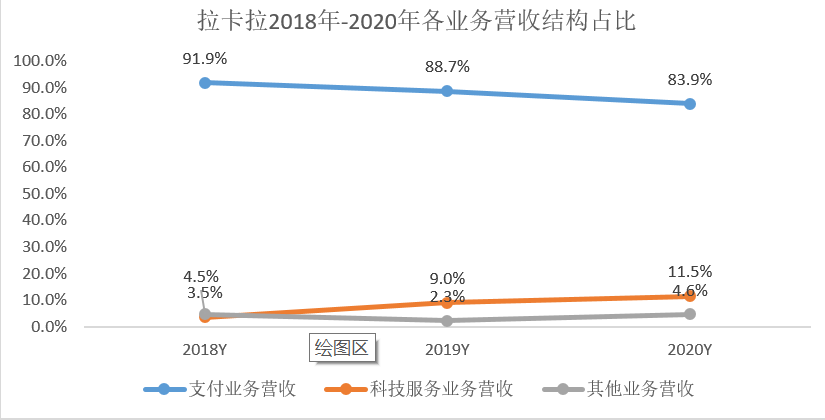其支付業(yè)務(wù)營收從2018年的52.2億元降至2020年的46.65億元,降幅明顯。而公司給予厚望的科技服務(wù)業(yè)務(wù)營收增速雖然迅猛,從2.01億元增至6.38億元,但因其基數(shù)較低,并不能填補(bǔ)支付業(yè)務(wù)下滑帶來的影響。