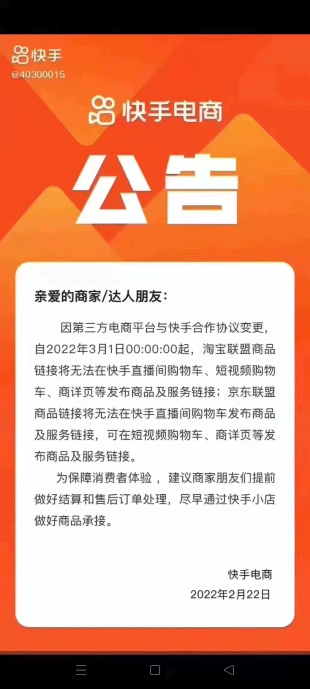 2月23日,快手電商發(fā)布公告稱,因第三方電商平臺(tái)與快手合作協(xié)議變更,自2022年3月1日0時(shí)起,淘寶聯(lián)盟商品鏈接將無(wú)法在快手直播間購(gòu)物車、短視頻購(gòu)物車、商詳頁(yè)等發(fā)布商品及服務(wù)鏈接;京東聯(lián)盟商品鏈接將無(wú)法在快手直播間購(gòu)物發(fā)布商品及服務(wù)鏈接,但可在短視頻購(gòu)物車、商詳頁(yè)等發(fā)布商品及服務(wù)鏈接。