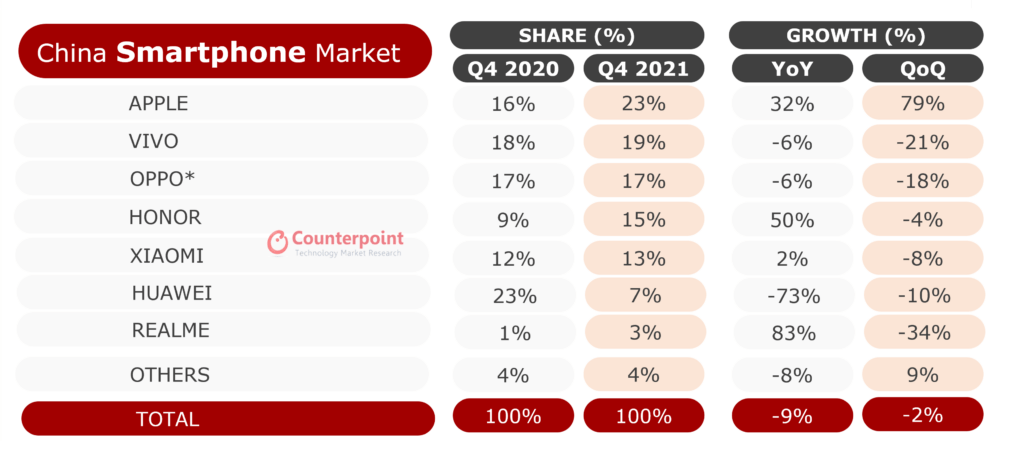 調(diào)研機構(gòu)Counterpoint發(fā)布的中國手機市場報告顯示,2021年第四季度,蘋果超過vivo,以23%市場份額位居第一。這是蘋果自2015年iPhone 6的巔峰之后,時隔六年再度拿下中國市場的季度銷量冠軍,大中華區(qū)更是成為蘋果所有區(qū)域中該季度增幅最大的地區(qū)。