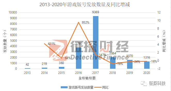 2013-2020年游戲版號發(fā)放數(shù)量及同比增減