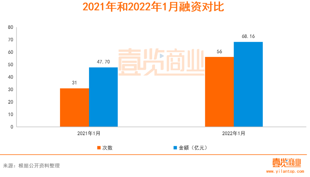 2022年,新消費(fèi)的風(fēng)似乎來得比去年迅猛。據(jù)《壹覽商業(yè)》不完全統(tǒng)計(jì),1月新消費(fèi)領(lǐng)域共發(fā)生56起融資事件,同比增長80%;融資金額為68.16億元,同比增長43%。其中不含8起未披露金額的融資。
