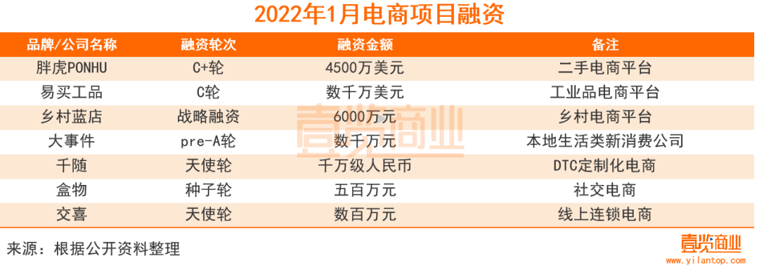 整體來看,電商是1月增長最快的賽道,據(jù)《壹覽商業(yè)》統(tǒng)計(jì)數(shù)據(jù)顯示,1月共有7個(gè)電商項(xiàng)目獲得融資,融資金額為5.88億元。