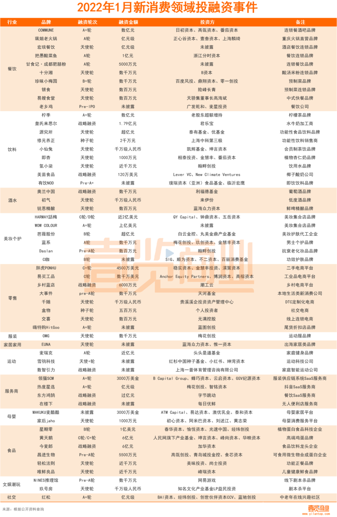 備注:融資以品牌或媒體披露時(shí)間為主,涉及多個(gè)賽道的首選品牌/企業(yè)的主營業(yè)務(wù)。對于向市場公開金額的融資,計(jì)算中用實(shí)際數(shù)字。對于沒有公開的金額融資,部分融資額數(shù)據(jù)為估算值,計(jì)算方法如下:數(shù)十萬=50萬;數(shù)百萬=300萬;數(shù)千萬=3000萬;數(shù)億=30000萬;近億及億元=10000萬;千萬級=1000萬;百萬級=100萬。外幣經(jīng)過換算,未披露融資金額暫不計(jì)入。