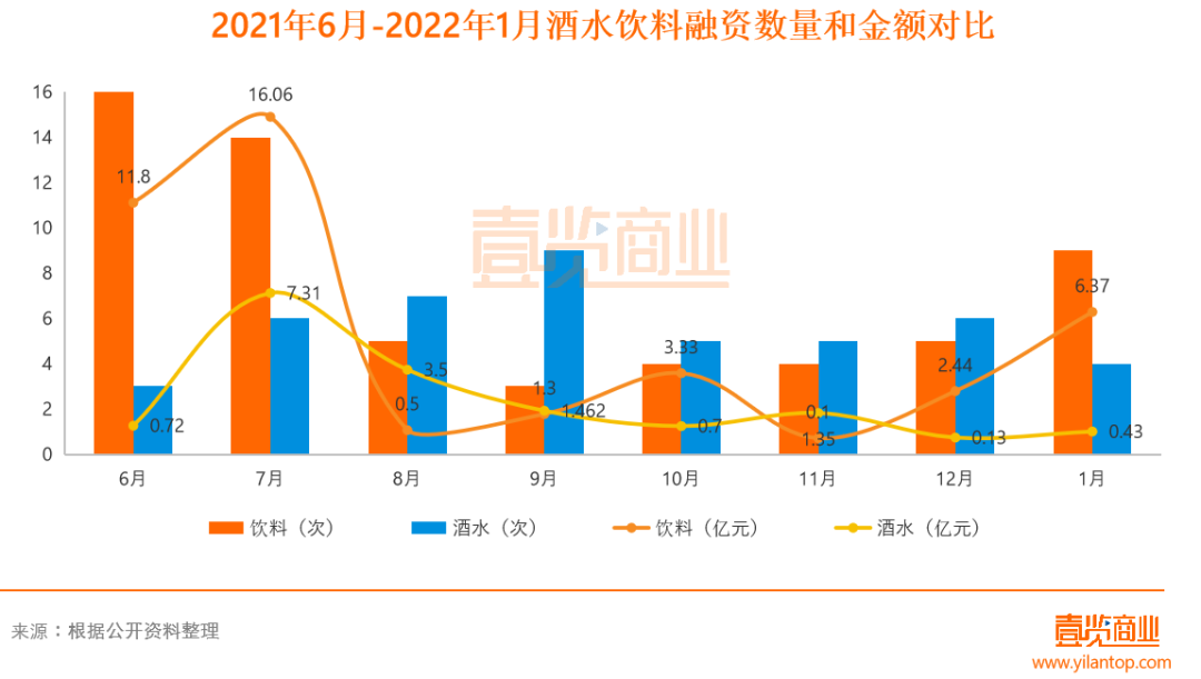 整體看來,比起前幾個(gè)月,飲料和酒水領(lǐng)域的融資總數(shù)持續(xù)增加。但在1月,飲料領(lǐng)域的融資數(shù)量重新超越酒水領(lǐng)域,融資金額也大幅回暖。