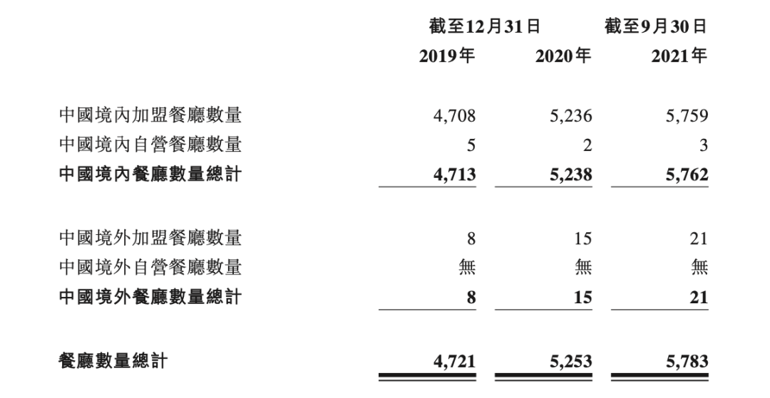 我們在招股書里可以看到:截至2021年9月30日,楊國福門店總數(shù)5783家,在國內(nèi)開出了5759家加盟餐廳,另有3家自營餐廳,此外,還在加拿大、美國、澳大利亞、日本、韓國、新加坡等國家開設了21家加盟店。
