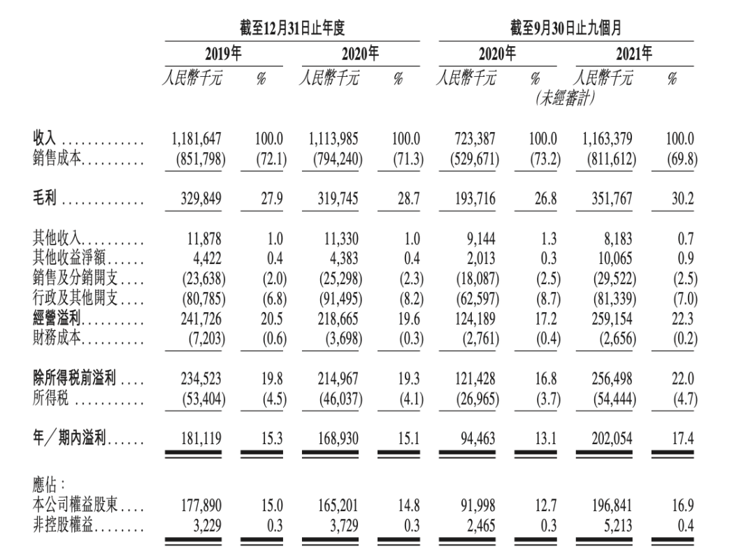 而根據(jù)招股書,2019年、2020年及2021年前九個月,楊國福收入分別達到11.82億元、11.14億元和11.63億元,同期利潤分別達到1.81億元、1.69億元和2.02億元;同期毛利率為分別為27.9%、28.7%和30.2%。