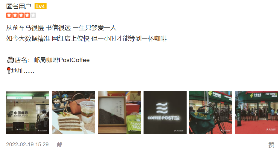 但目前,郵局咖啡在大眾點(diǎn)評網(wǎng)的評分并不高,3.7分。拉低分?jǐn)?shù)的主要原因在服務(wù),吐槽最多的便是“出品慢”??磥恚弧按蚩ňW(wǎng)友的熱情”嚇到的郵局咖啡,還需要進(jìn)一步打磨團(tuán)隊以及出單模式。