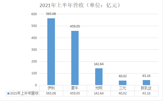 根據(jù)2021Q2財(cái)報(bào)顯示,2021年上半年伊利營收為565.06億元,蒙牛為459.05億元。而排名第三的光明僅為142.64億元,與蒙牛的差距達(dá)到了三百億之多。而像三元、新乳業(yè)等規(guī)模更小的地方性乳企營收都在50億元以下。