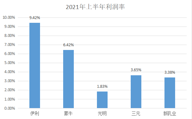2021年上半年數(shù)據(jù)顯示,新乳業(yè)的利潤率為3.38%,遠(yuǎn)低于同期伊利和蒙牛的9.42%和6.42%,同時(shí)也不及三元股份的3.65%。值得一提的是,在廣告費(fèi)用支出上,新乳業(yè)比主打北京地區(qū)的三元股份還要高出1.6億元。