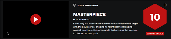 知名游戲媒體IGN給出了10分的罕見(jiàn)評(píng)價(jià),認(rèn)為本作“FromSoftware(FS社) 繼承了《塞爾達(dá):曠野之息》的核心精神,無(wú)縫嵌入了《黑暗之魂》系列的完整玩法,開(kāi)拓出一片迷人的開(kāi)放世界,內(nèi)容之豐富,探索自由度之高,可謂絕無(wú)僅有。這么說(shuō)吧,《艾爾登法環(huán)》帶給我的游戲體驗(yàn)絕對(duì)稱(chēng)得上此生難忘?!盜GN在這篇滿分評(píng)價(jià)中,形容游戲過(guò)程時(shí)而“怒火攻心”時(shí)而“大喜過(guò)望”,時(shí)而“心力交瘁”,但總歸“是翻涌不已的驚嘆之情”。