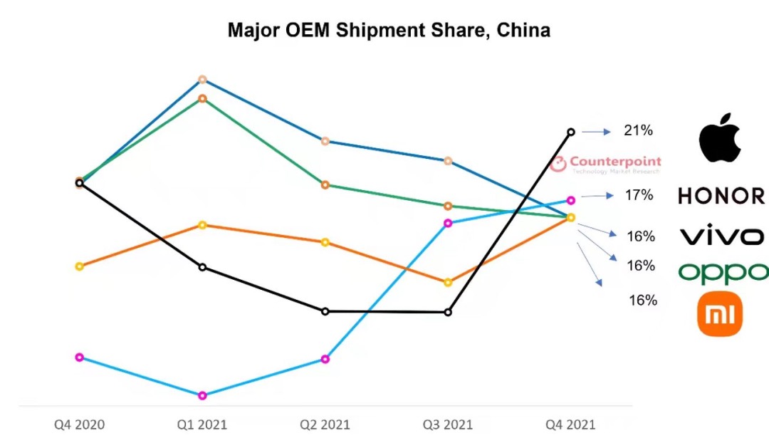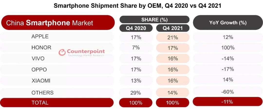 據(jù)Counterpoint,2021年第四季度,中國(guó)智能手機(jī)出貨量同比下降11%。而榮耀回歸后,市場(chǎng)份額較去年同期的7%暴增至17%,排名首次升至第二,位列安卓陣營(yíng)榜首。該機(jī)構(gòu)分析師稱,“榮耀與蘋(píng)果的表現(xiàn)改變了競(jìng)爭(zhēng)格局”。