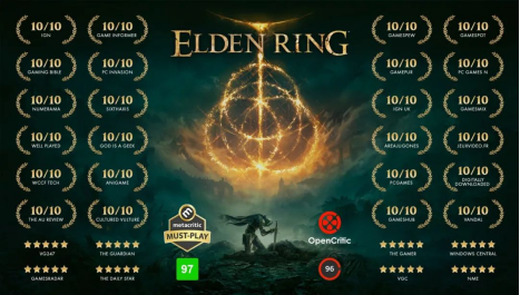 這是知名游戲制作人宮崎英高繼《只狼:影逝二度》后,蟄伏三年推出的魂系大作,一經(jīng)上線便迅速登上熱搜并打破銷量紀(jì)錄,在線人數(shù)峰值達(dá)到了近90萬人。同時(shí)參與評價(jià)的45家媒體均為《艾爾登法環(huán)》給出好評,其中多家媒體打出滿分。