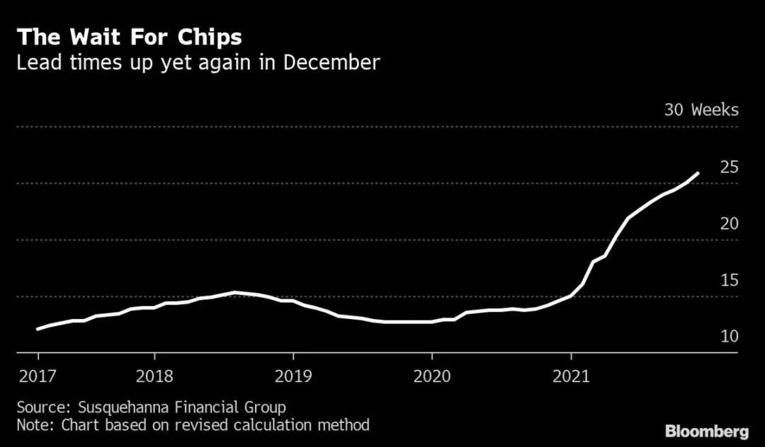芯片交付時間從通常情況下的10周急劇增長到26周,也就是說,現(xiàn)在買芯片要至少等半年的時間。