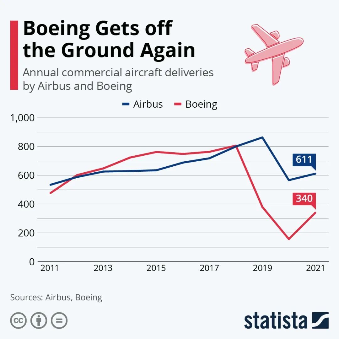 民航客機的產(chǎn)量遠低于汽車。2021年,空客的民航客機交付量為611架,波音為340架。