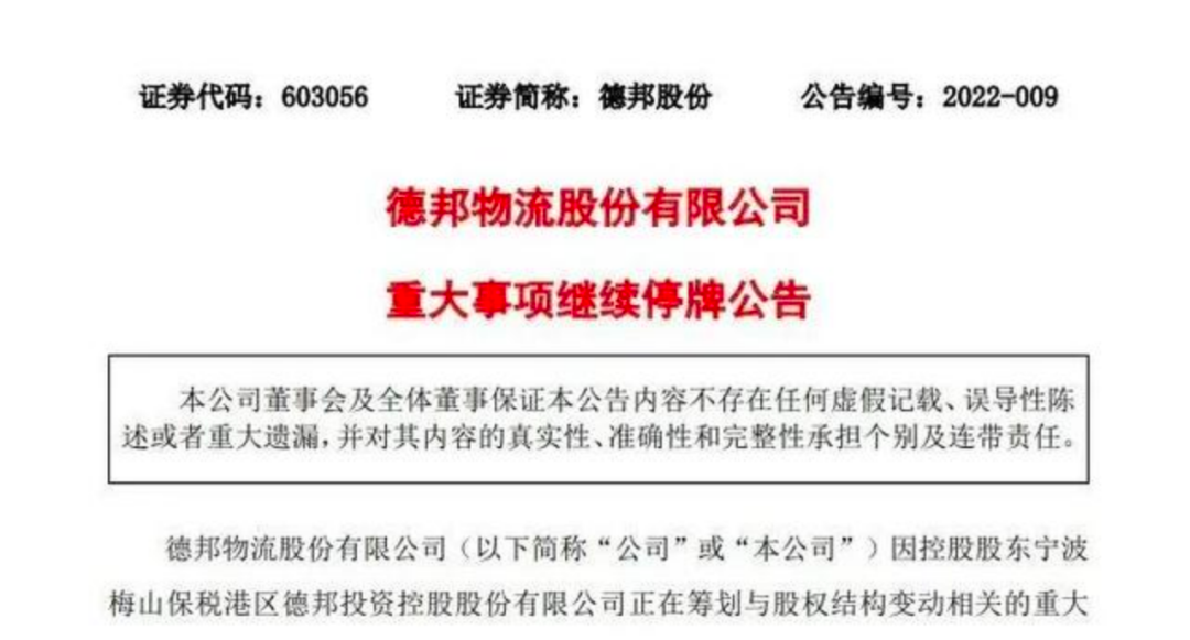 3月1日晚間,德邦股份再次發(fā)布繼續(xù)停牌公告稱,為期兩天的停牌期間,交易各方就控股股東股權(quán)結(jié)構(gòu)變動(dòng)相關(guān)事項(xiàng)進(jìn)行了進(jìn)一步溝通協(xié)商,尚未簽署相關(guān)交易協(xié)議,公司預(yù)計(jì)無法在3月2日開市起復(fù)牌。經(jīng)公司申請,公司股票自3月2日起繼續(xù)停牌,預(yù)計(jì)停牌時(shí)間不超過3個(gè)交易日。