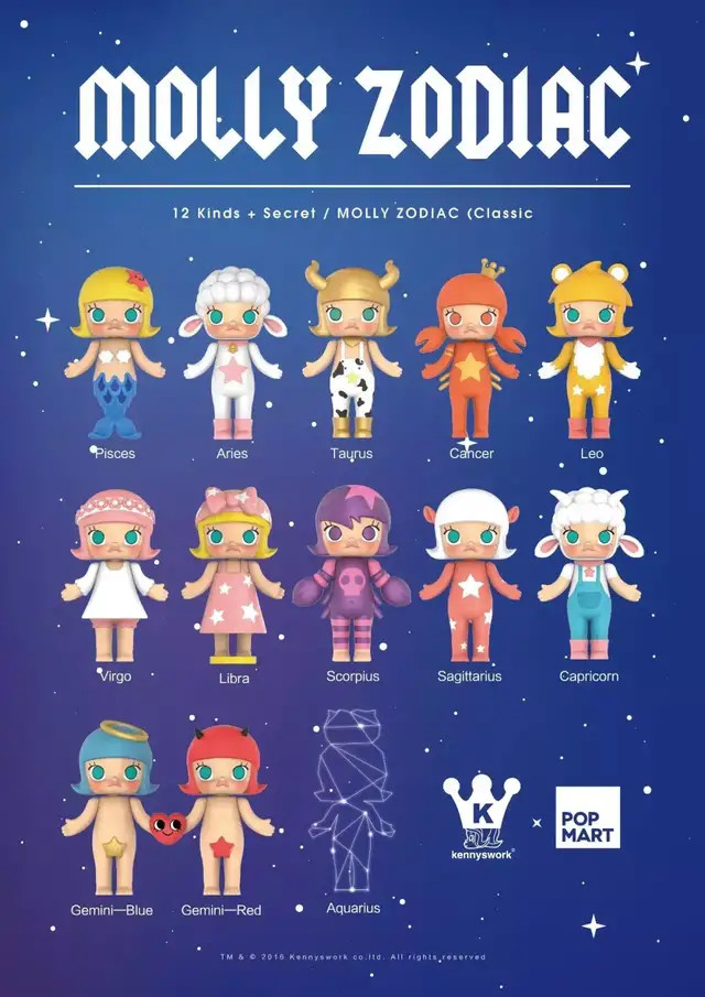 2016年7月,Molly的首款星座系列盲盒在泡泡瑪特天貓旗艦店開(kāi)售,4秒鐘200套被搶購(gòu)一空。很快,盲盒大火,抖音up主每天花一兩千塊開(kāi)盲盒,二手交易市場(chǎng)上,隱藏款盲盒可以被賣出幾十倍的價(jià)格。Molly也成為潮玩市場(chǎng)最當(dāng)紅的形象IP?!赋蓖妗挂辉~也開(kāi)始從設(shè)計(jì)師玩具或藝術(shù)家玩具,擴(kuò)大到「給成年人的玩具」被市場(chǎng)接受。