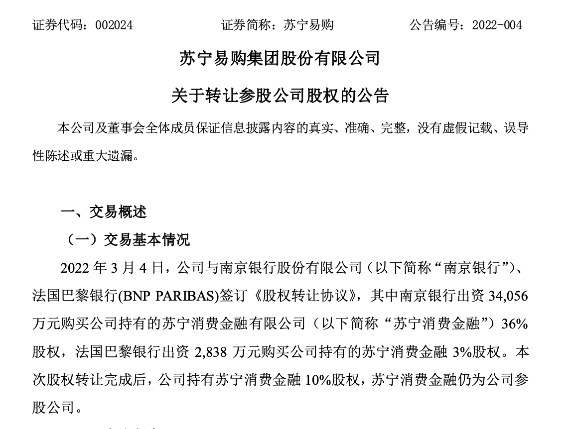 3月8日消息,蘇寧易購(002024)發(fā)布公告稱,分別向南京銀行、法國巴黎銀行(BNP PARIBAS)出售蘇寧消費金融36%和3%的股權(quán)。交易完成后,蘇寧易購將成為蘇寧消費金融小股東,持有10%股權(quán),而南京銀行將成為絕對大股東。