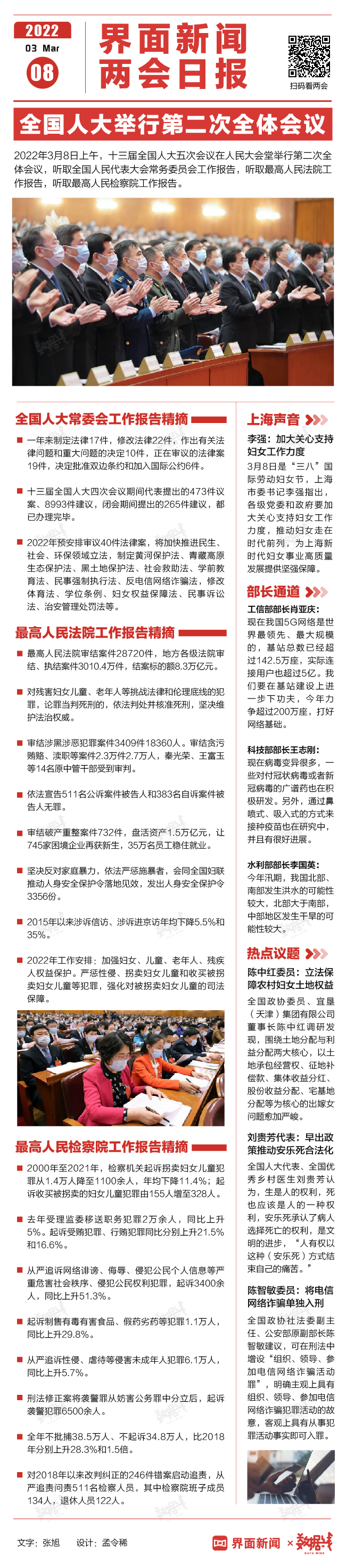 2022年3月8日上午,十三屆全國人大五次會議在人民大會堂舉行第二次全體會議,聽取全國人民代表大會常務(wù)委員會工作報告,聽取最高人民法院工作報告,聽取最高人民檢察院工作報告。
