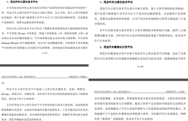 但用友汽車卻在回復(fù)上交所問詢時(shí)表示,公司的云原生技術(shù)平臺(tái)并不是開源平臺(tái),而是自主研發(fā)的、具有獨(dú)立知識(shí)產(chǎn)權(quán)和獨(dú)特核心技術(shù)的平臺(tái)。緊接著,在招股書上會(huì)稿中,有關(guān)該平臺(tái)的介紹內(nèi)容就遭到大幅削減,涉及開源技術(shù)的內(nèi)容也被刪除。
