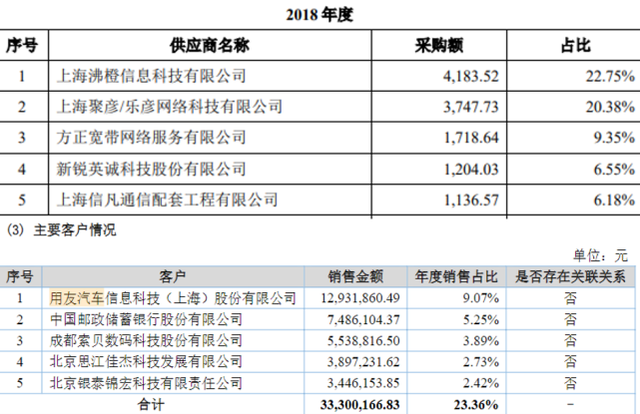 值得一提的是,用友汽車招股書與供應(yīng)商年報(bào)所披露的采購額存在一定差異。招股書中,新銳英誠為用友汽車2018年第四大供應(yīng)商,對(duì)應(yīng)采購金額為1204.03萬元。但在新銳英誠2018年年報(bào)中,用友汽車為其2018年第一大客戶,對(duì)應(yīng)銷售金額為1293.19萬元。