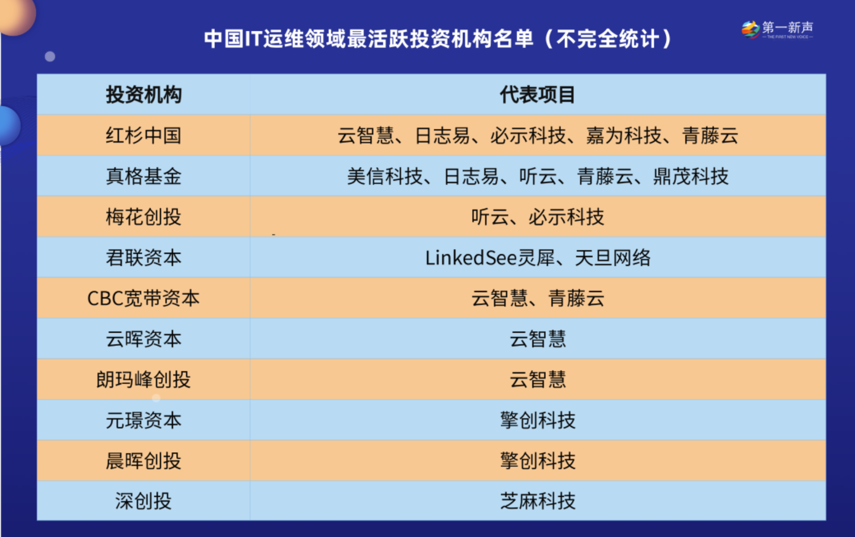 第一新聲發(fā)現(xiàn),在IT運(yùn)維領(lǐng)域活躍著一批國(guó)內(nèi)知名投資機(jī)構(gòu),其中不乏紅杉資本、真格基金、晨暉資本、云暉資本、梅花創(chuàng)投等身影。