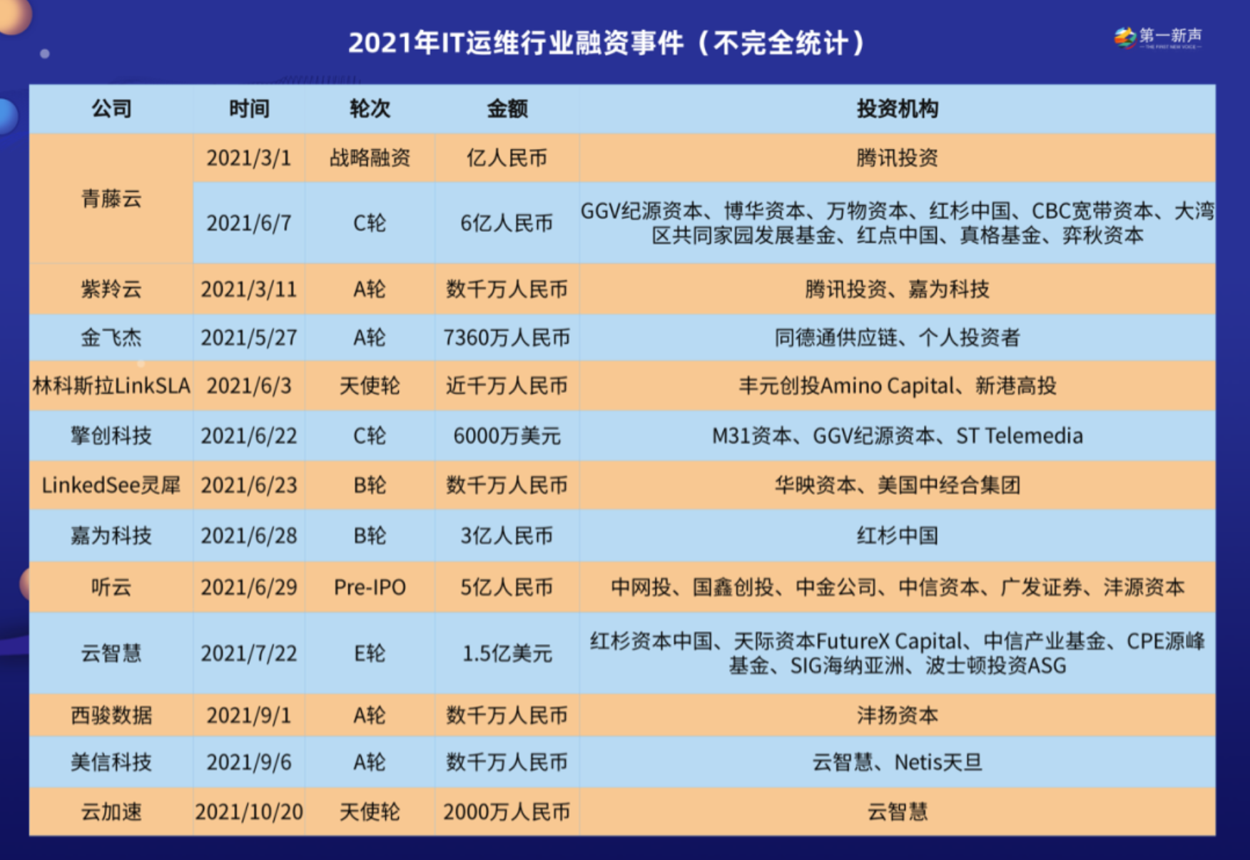 融資金額達(dá)到歷史高峰,第一新聲根據(jù)IT桔子不完全統(tǒng)計(jì),2021年IT運(yùn)維行業(yè)相關(guān)融資事件共有24起,融資金額約54.7億元。例如云智慧、擎創(chuàng)科技、聽(tīng)云等企業(yè)先后完成E、D、C輪融資。紅杉資本、GGV紀(jì)源資本、云暉資本、晨暉資本等知名投資機(jī)構(gòu)的身影不斷浮現(xiàn)。